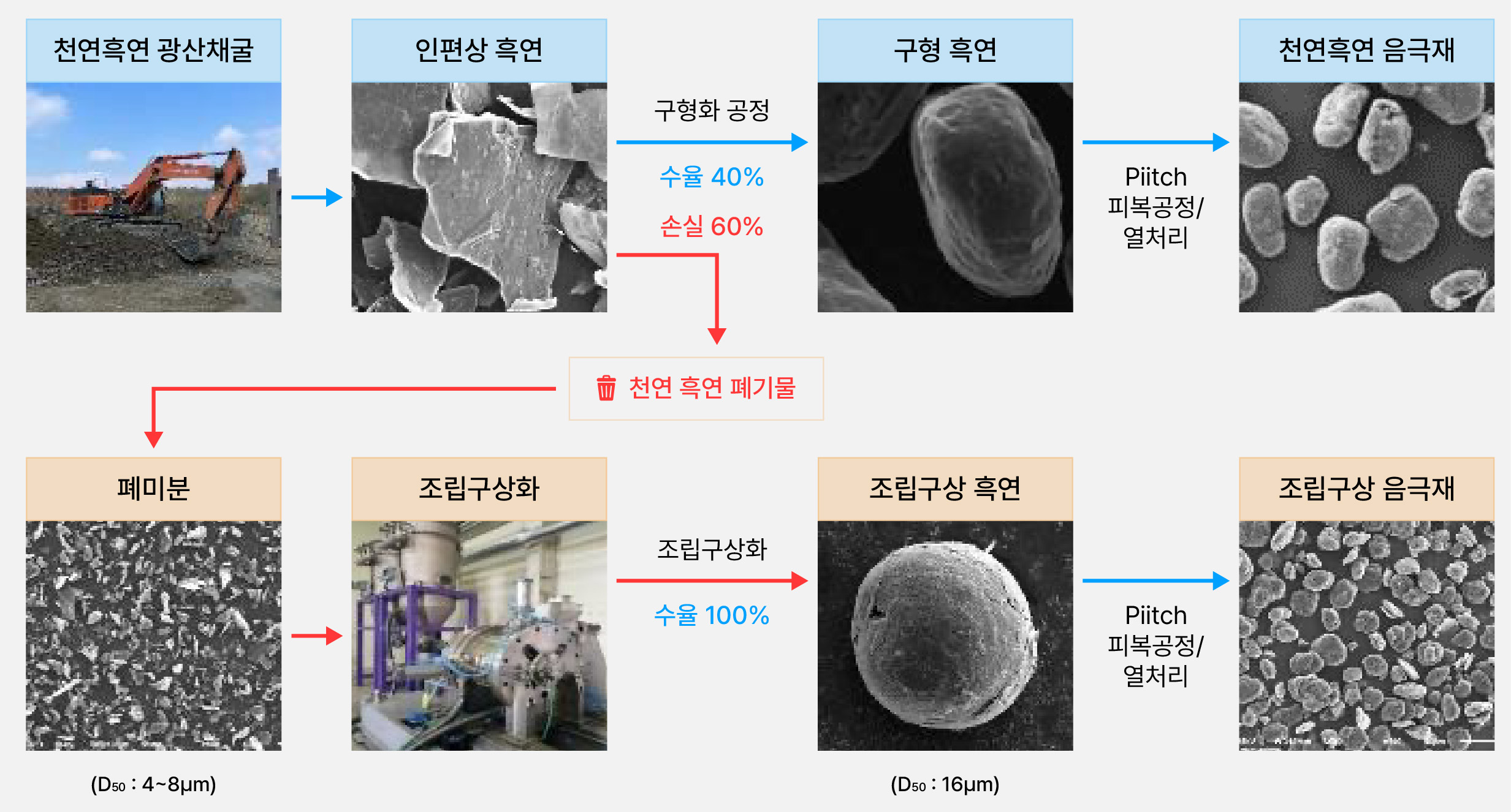 기존 공정에서 활용도가 낮은 천연흑연 미분을 조립구상화 공정에 적용해,